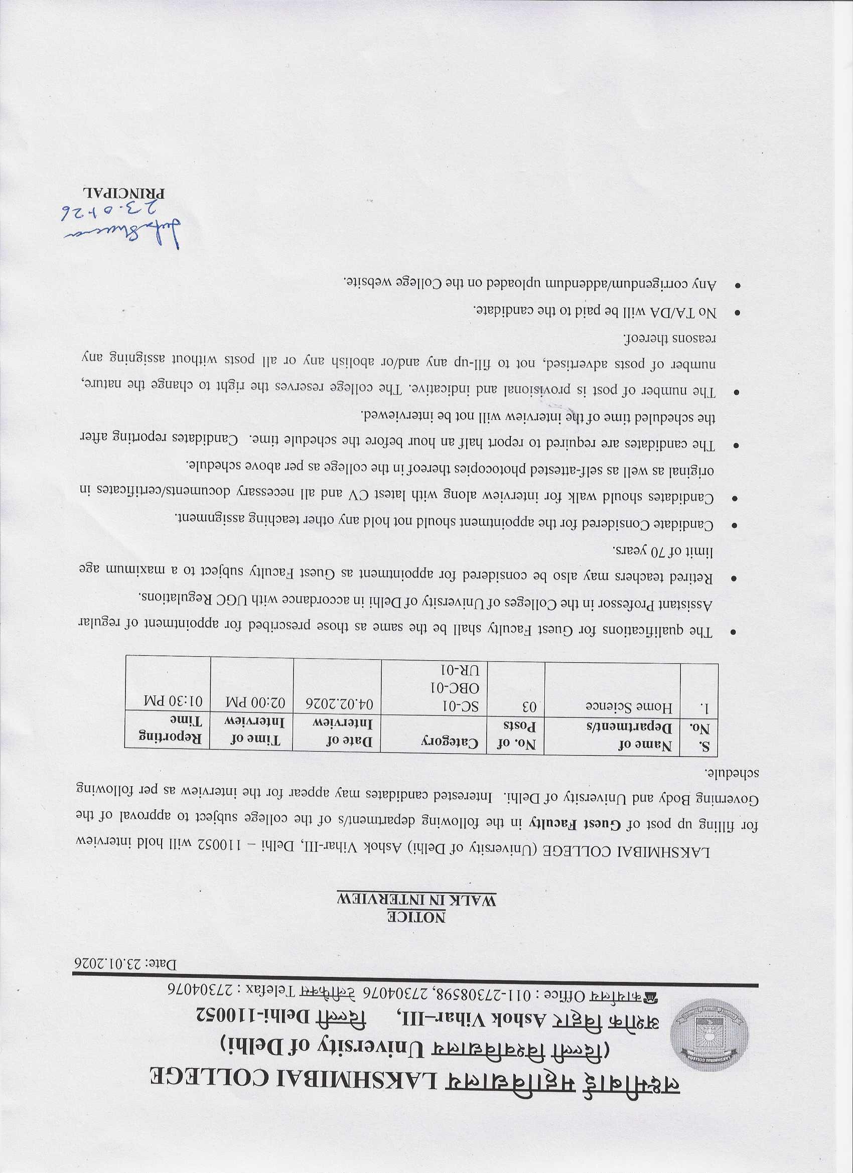| 1 | Notice: Walk in Interview for the post of guest faculty in Home Science department, Lakshmibai College 2026 | View |