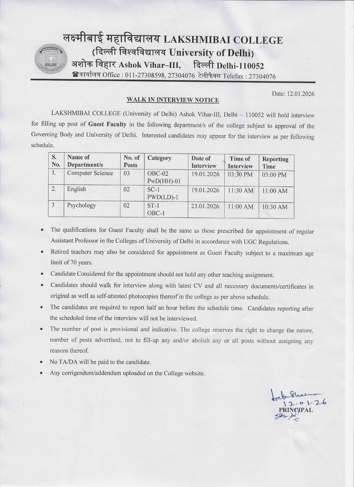 Notice for Walk In Interview Schedule for the guest faculty for various departments department (English, Psychology, Computer Science) - Jan 2026