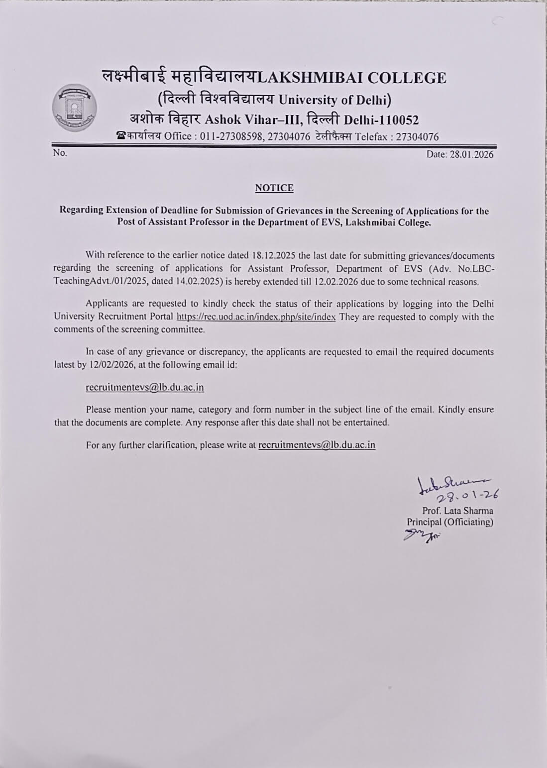 Notice: Extension of Deadline for Submission of Grievances in the Screening of Applications for the Post of Assistant Professor in the Department of EVS, Lakshmibai College