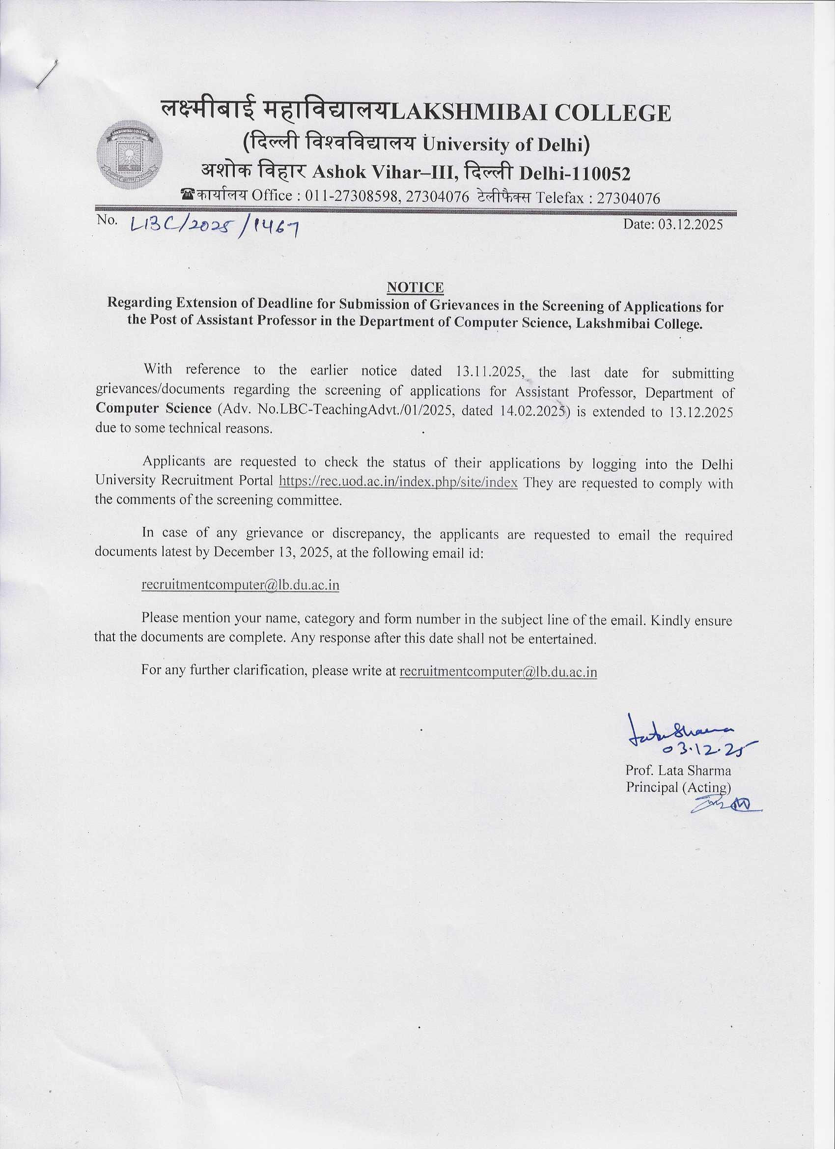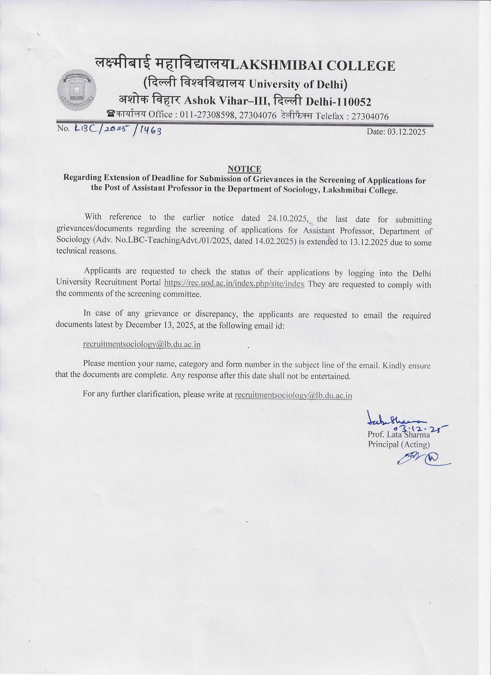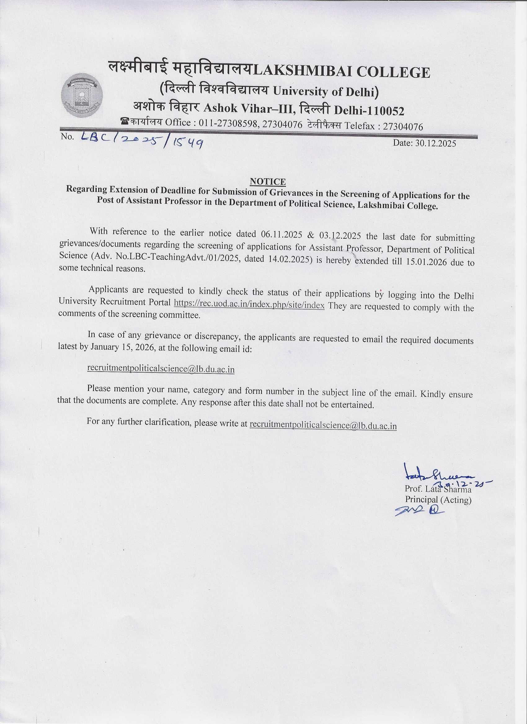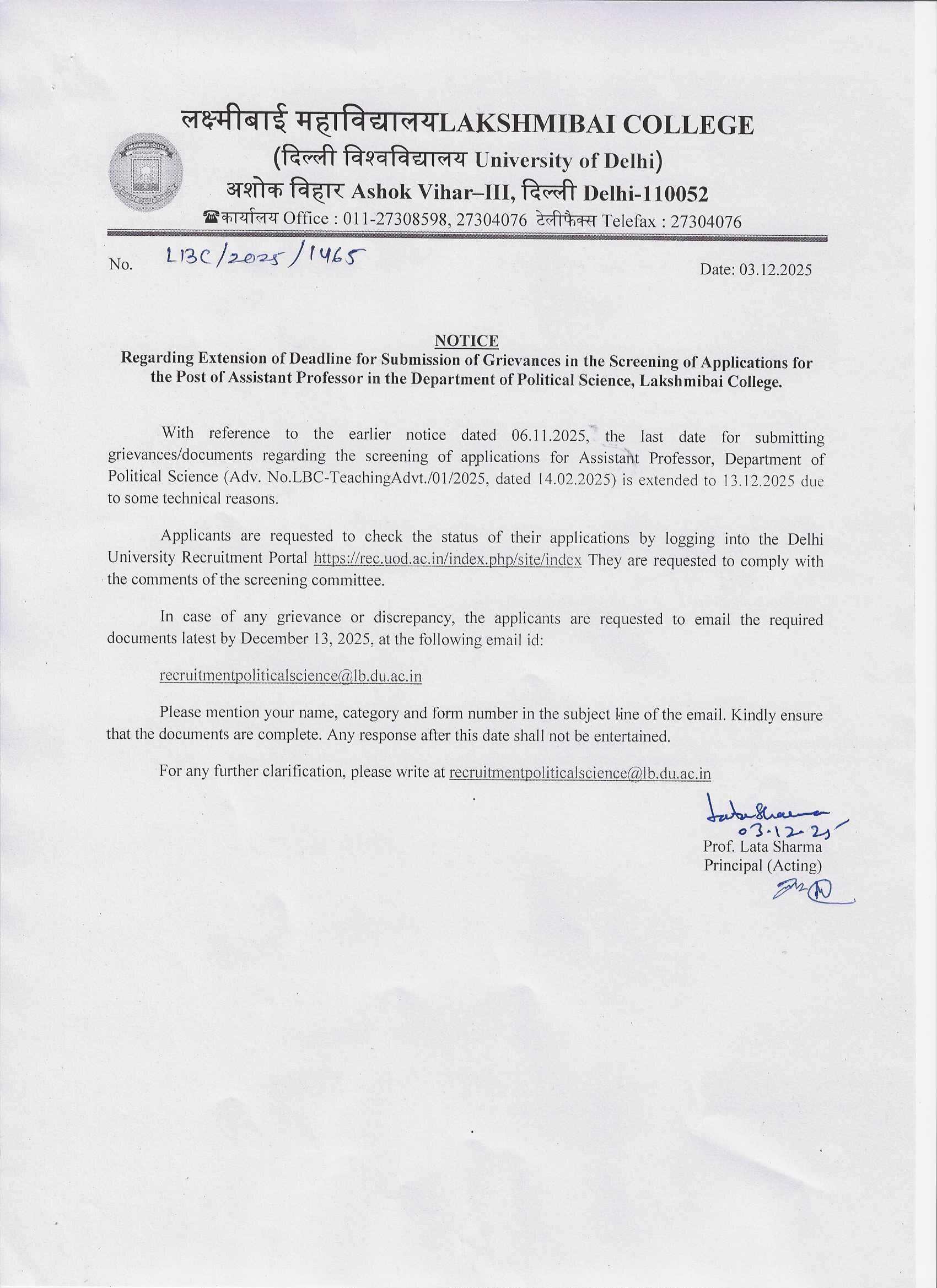 | NOTICE - Regarding Extension of Deadline for Submission of Grievances in the Screening of Applications for the Post of Assistant Professor in the Department of Political Science, Lakshmibai College | View File |