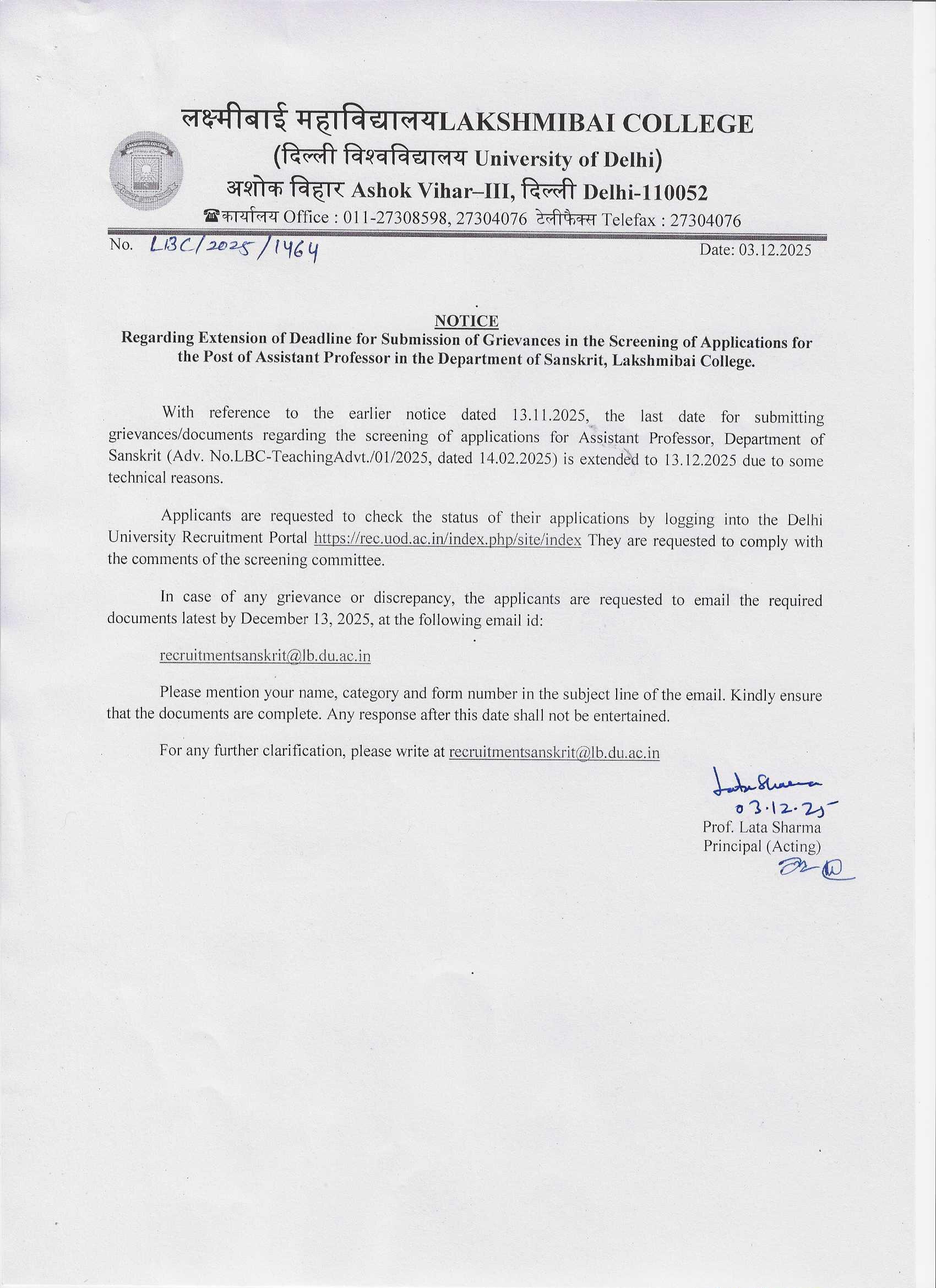 | NOTICE - Regarding Extension of Deadline for Submission of Grievances in the Screening of Applications for the Post of Assistant Professor in the Department of Sanskrit, Lakshmibai College. | View File |