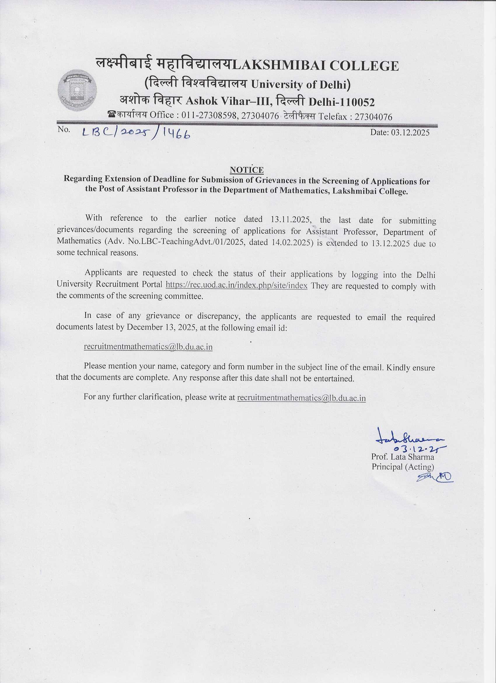 | NOTICE - Regarding Extension of Deadline for Submission of Grievances in the Screening of Applications for the Post of Assistant Professor in the Department of Mathematics, Lakshmibai College. | View File |